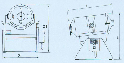 型號 | 料筒容積(L) | 裝料容積(L) | 最大裝料量(k/g批) | 搖動、轉動次數r/min | 電機總功率(kw) | 外形尺寸(mm) | 總重量(kg) | 料筒重量(kg) |