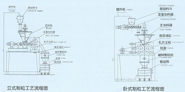 立式制粒工藝除了加料方式和軋輥安裝方式與臥式制粒機(jī)組不同外,其工作原理完全相同。在立式制粒機(jī)組中,粉料由振動(dòng)料斗進(jìn)入攪拌器被攪拌脫氣后,由定量加料器的螺旋送至兩個(gè)上下設(shè)置的軋輥的弧形槽內(nèi)并被預(yù)壓,以后工藝過程和臥式制粒機(jī)組相同。